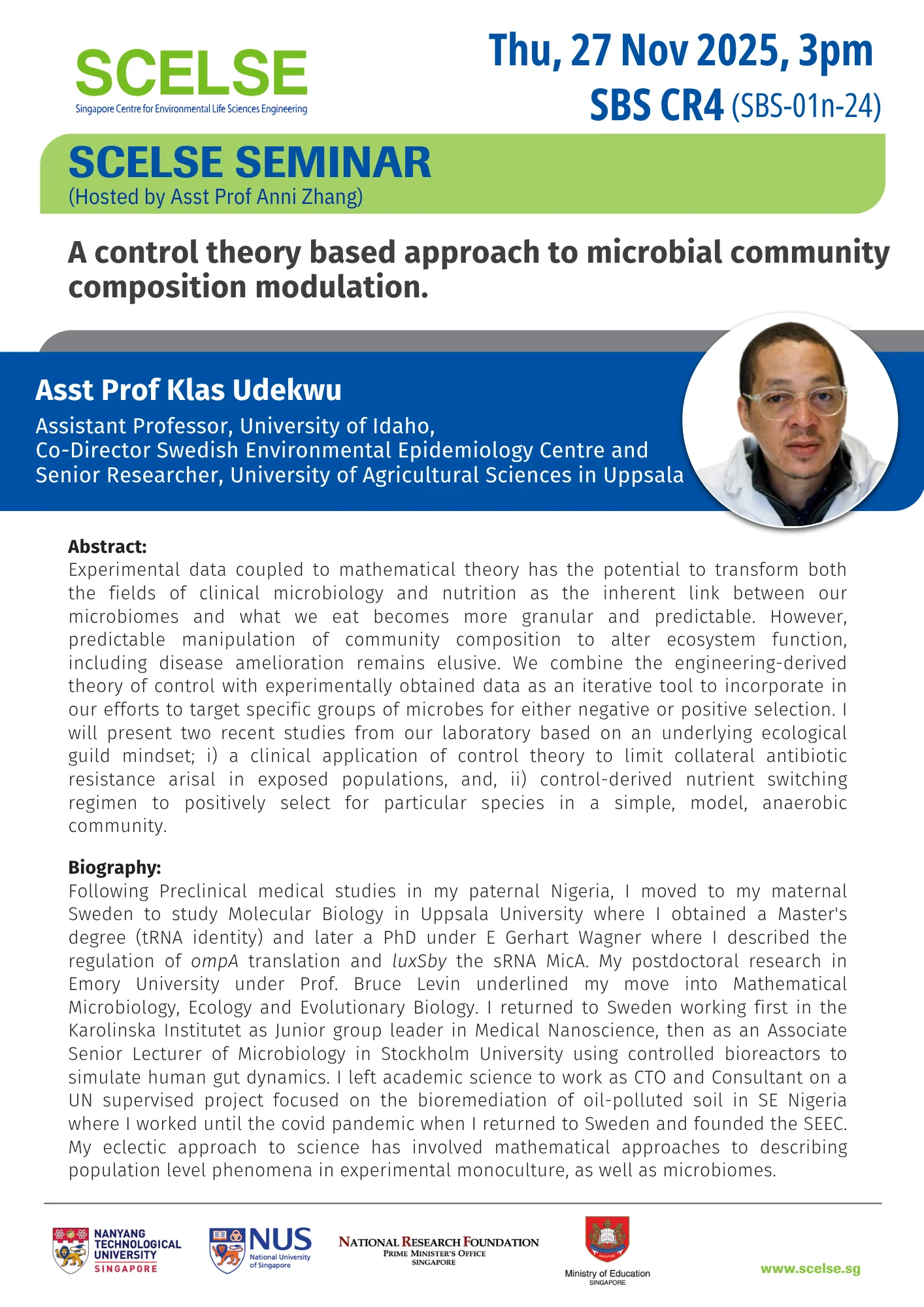 Following Preclinical medical studies in my paternal Nigeria, I moved to my maternal Sweden to study Molecular Biology in Uppsala University where I obtained a Master’s degree (tRNA identity) and later a PhD under E Gerhart Wagner where I described the regulation of ompA translation and luxSby the SRNA MicA. My postdoctoral research in Emory University under Prof. Bruce Levin underlined my move into Mathematical Microbiology, Ecology and Evolutionary Biology. I returned to Sweden working first in the Karolinska Institutet as Junior group leader in Medical Nanoscience, then as an Associate Senior Lecturer of Microbiology in Stockholm University using controlled bioreactors to simulate human gut dynamics. I left academic science to work as CTO and Consultant on a UN supervised project focused on the bioremediation of oil-polluted soil in SE Nigeria where I worked until the covid pandemic when I returned to Sweden and founded the SEEC. My eclectic approach to science has involved mathematical approaches to describing population level phenomena in experimental monoculture, as well as microbiomes.
