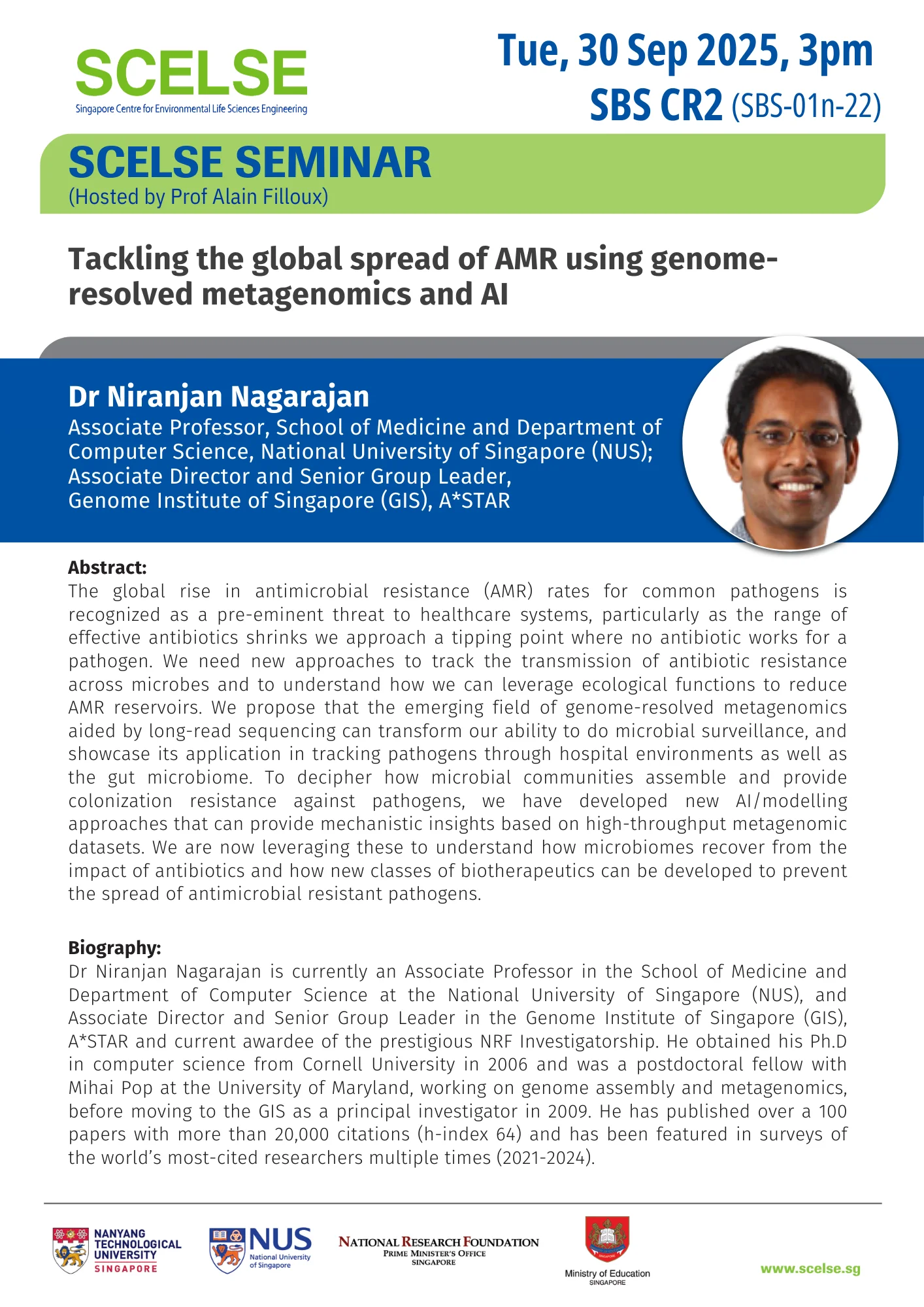 Dr Niranjan Nagarajan is currently an Associate Professor in the School of Medicine and Department of Computer Science at the National University of Singapore (NUS), and Associate Director and Senior Group Leader in the Genome Institute of Singapore (GIS), A*STAR and current awardee of the prestigious NRF Investigatorship. He obtained his Ph.D in computer science from Cornell University in 2006 and was a postdoctoral fellow with Mihai Pop at the University of Maryland, working on genome assembly and metagenomics, before moving to the GIS as a principal investigator in 2009. He has published over a 100 papers with more than 20,000 citations (h-index 64) and has been featured in surveys of the world’s most-cited researchers multiple times (2021-2024).